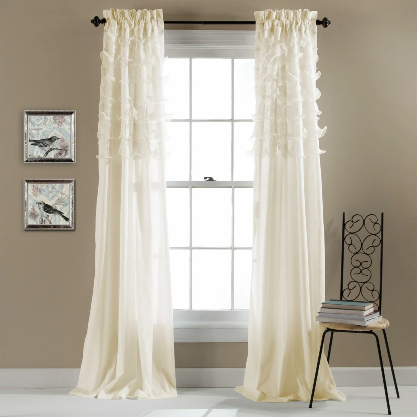 The Triangle Home Fashions Avery Rod Pocket Curtain Pair dresses up the traditional sheer panel design with ripples of diaphanous tiers along the top. Truly dreamy, the design draws the eye without overwhelming the decor, and itβs available in your choice of colors. Youβll get two panels with your order, and each features a three-inch rod pocket and 100% polyester microfiber construction. Dry clean or machine wash cold.