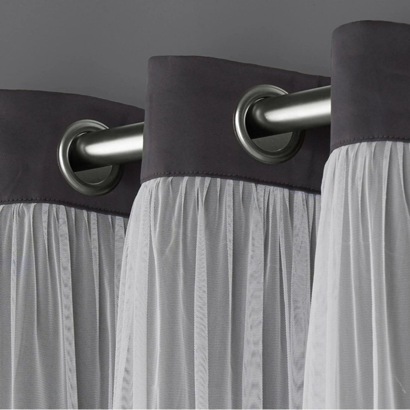 - Blackout-style curtain with sheer panel overlay and silver grommets