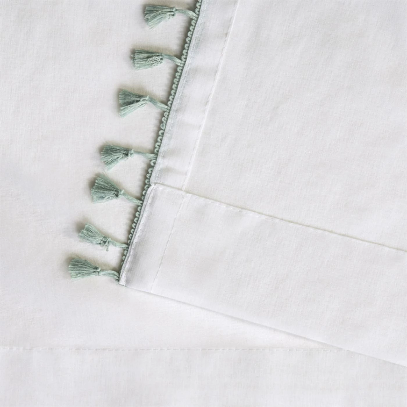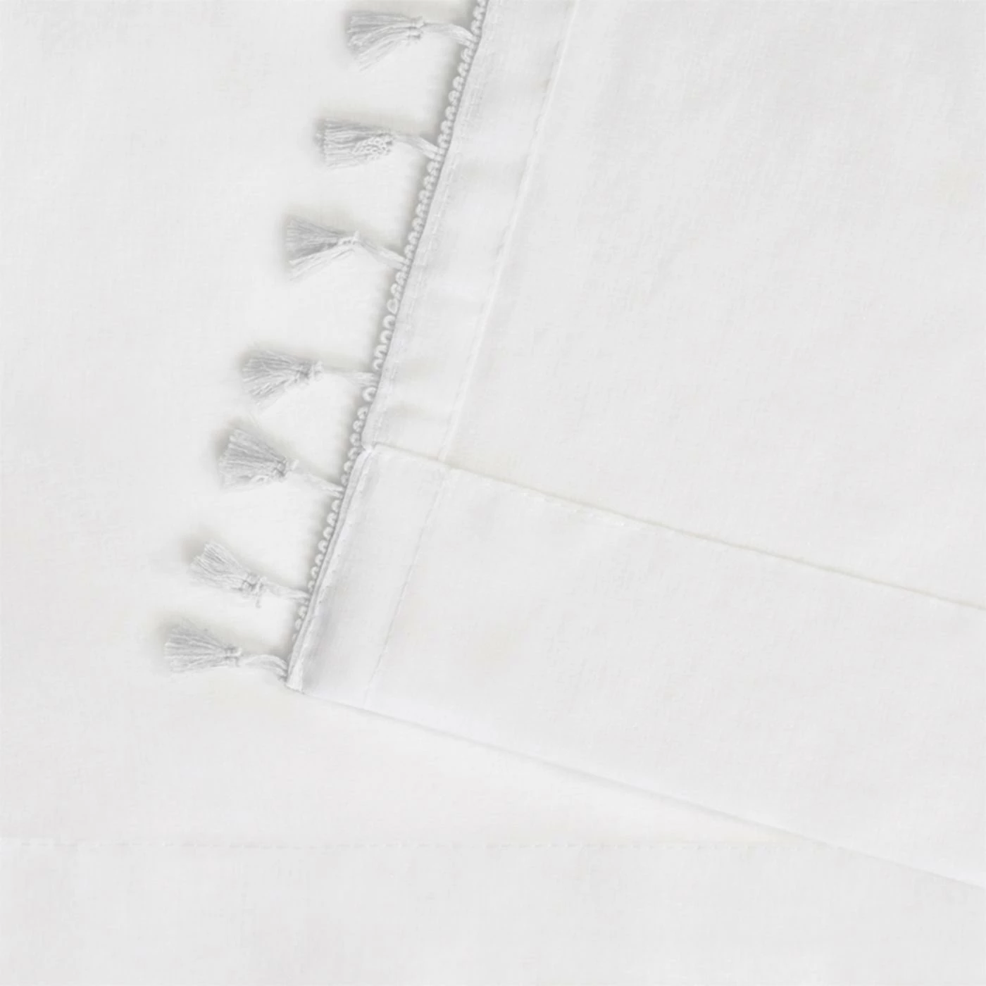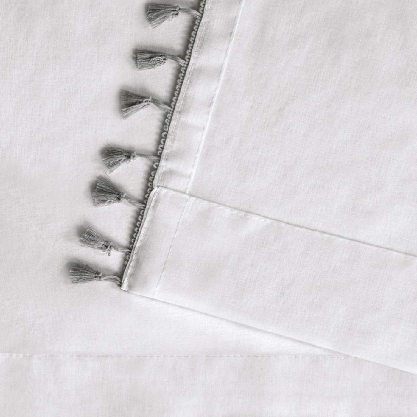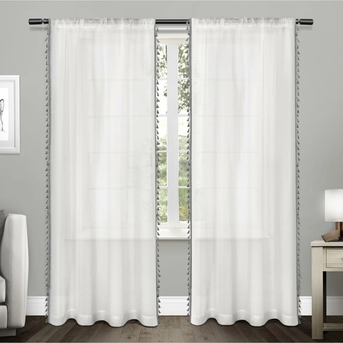Petite tassels border theExclusive Home Tassels Textured Sheer Curtain Panel Pair and are sure to bring a touch of trendy flair to your interior. Their texture contrasts with the simple elegance of the Belgian linen weave draperies, which are soft, light, and slightly sheer. A sewn-in rod pocket along the top allows you to pull the panels onto rods up to 1-5/8 inches in diameter.