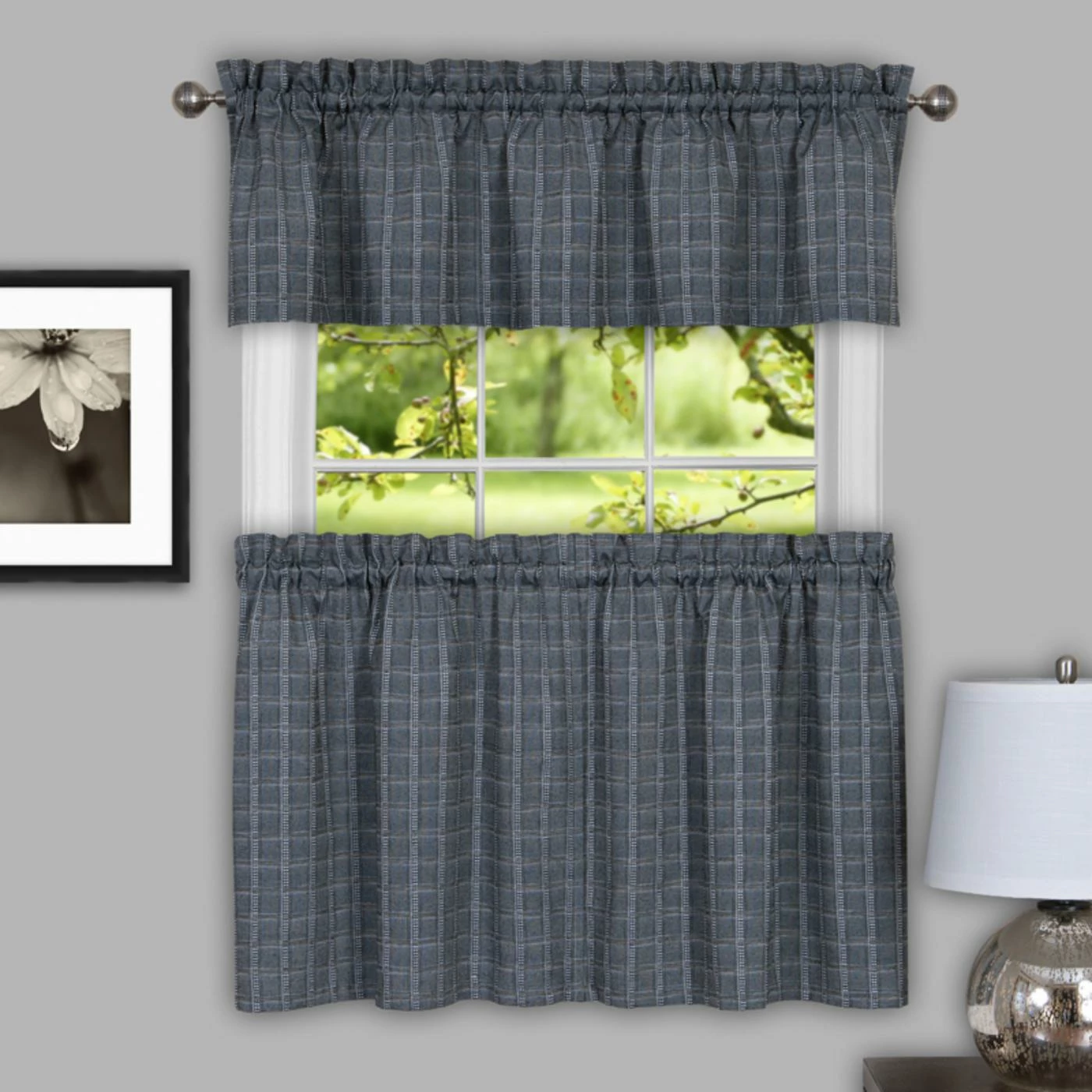 The laidback Achim Sydney Curtain Set sports a textured plaid pattern and crisp, linen-look fabric. Handsome color options ensure this curtain set works in any room. Its rod pocket construction presents a classic look. Add on the valance to make it complete. Easy-care polyester and cotton makes this curtain set machine washable. Panel size options and your choice of configurations creates a good fit.