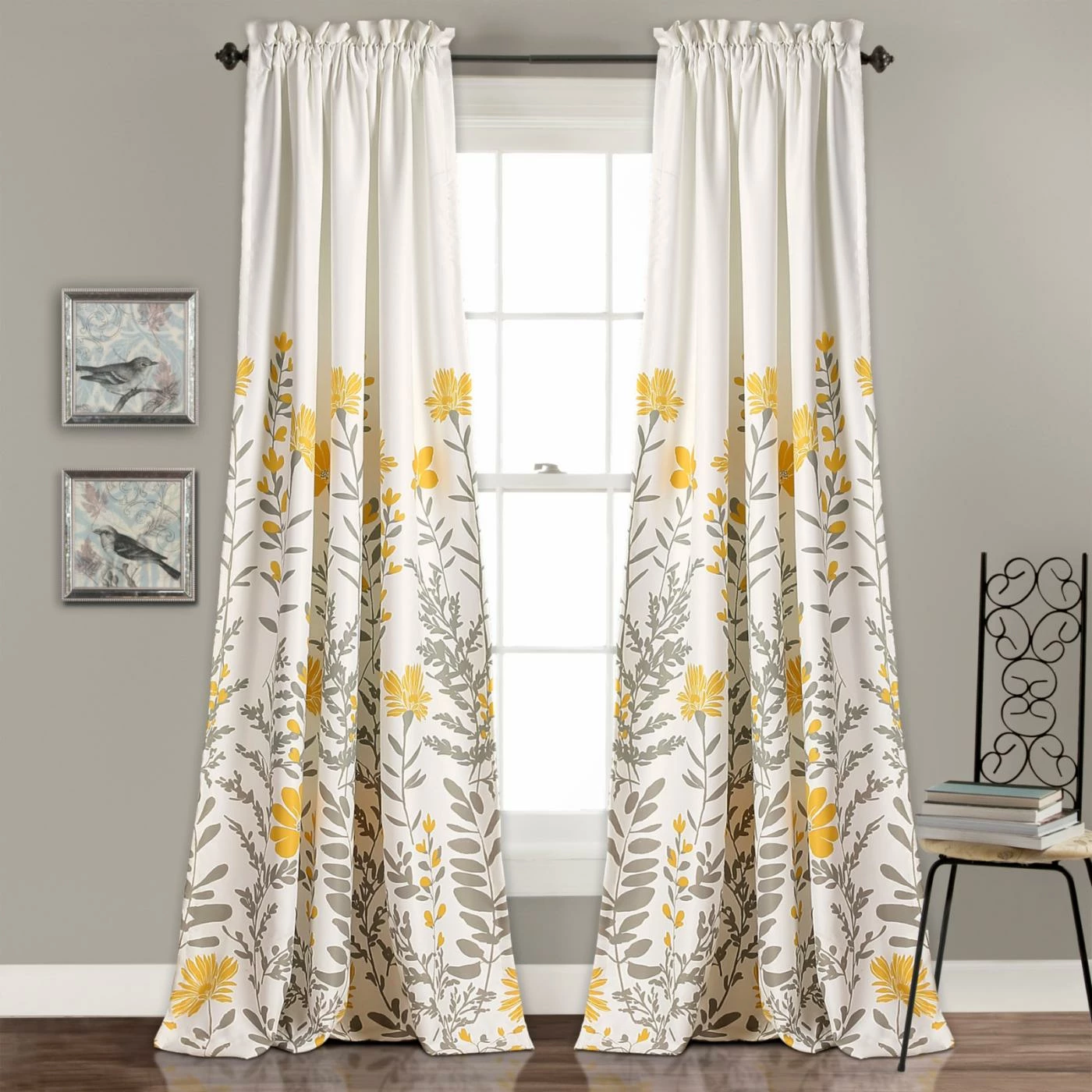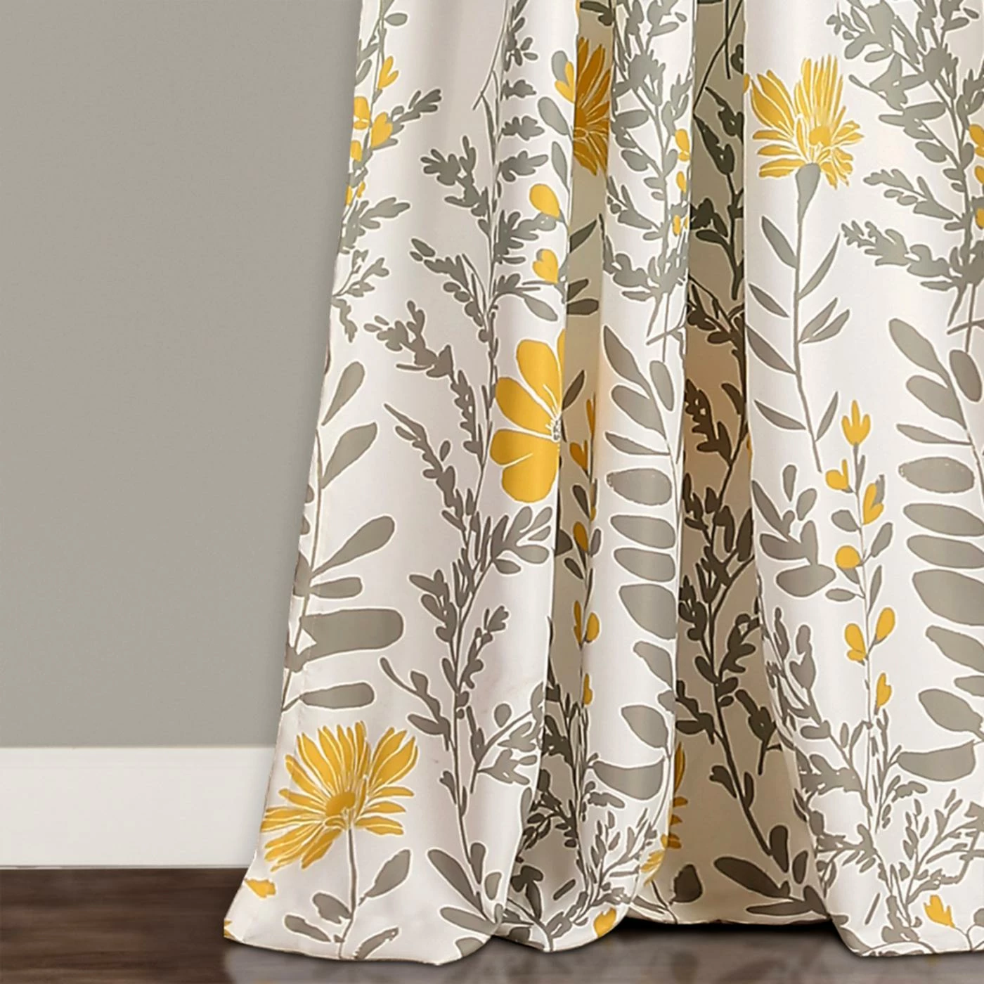 Cheery yellow and gray flowers on crisp white ground ensure the Aprile Room Darkening Curtain Panel Pair by Half Moon will brighten any room. Room darkening linings make these curtains perfect for bedrooms and living areas. The set includes two curtain panels with rod pocket construction for a classic look. They’re made of polyester and are machine washable.