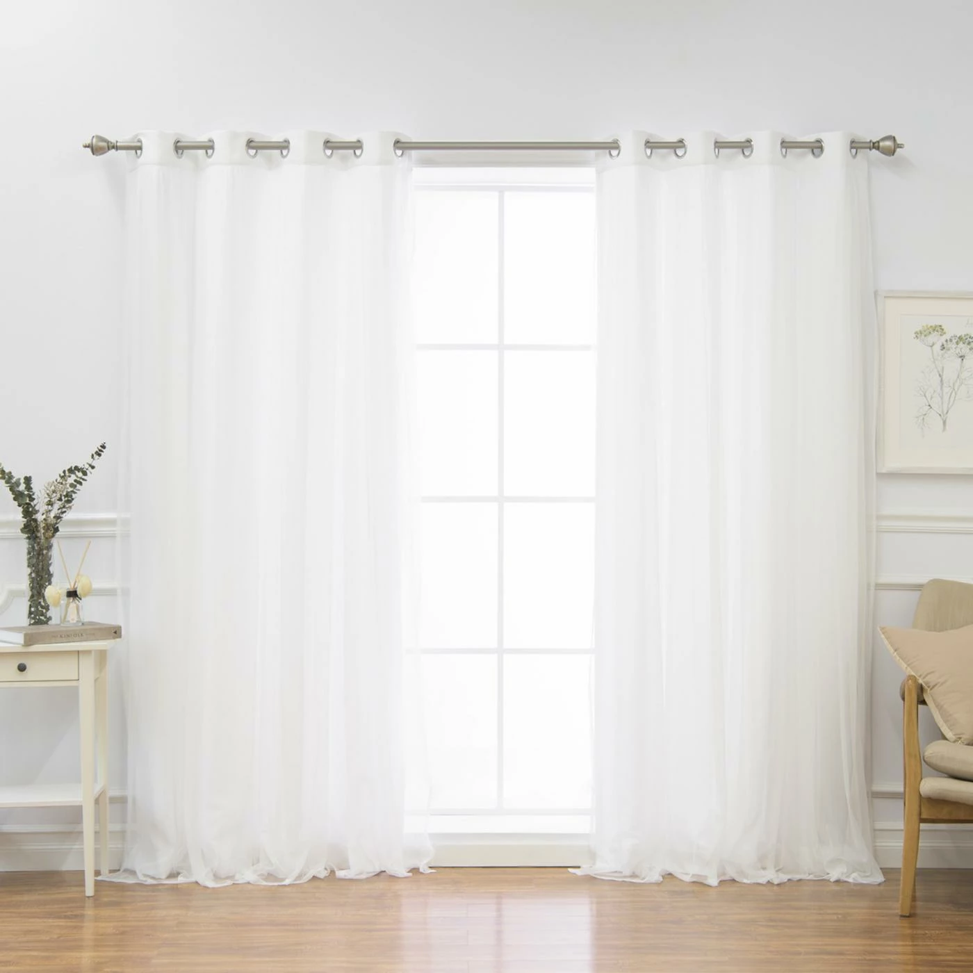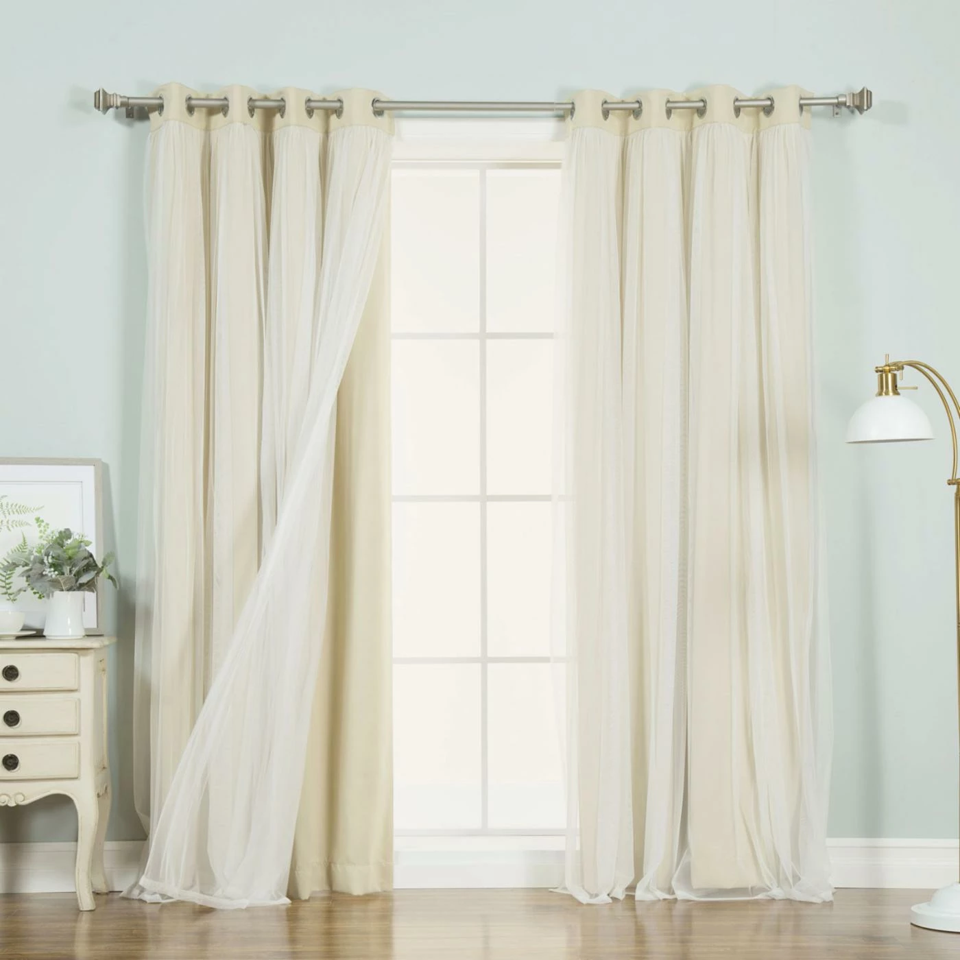 The machine washable Best Home Fashion Marry Me Blackout Grommet Curtain Panel Pair with Tulle Overlay impresses with its triple weave construction and delicate polyester material for impressive light control and temperature management. The sheer tulle overlay creates an airy, layered look. This curtain panel pair comes in your choice of available size and color options.