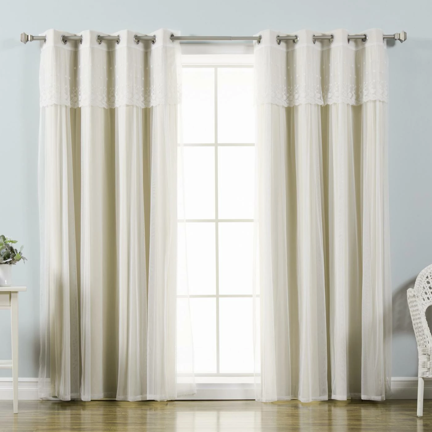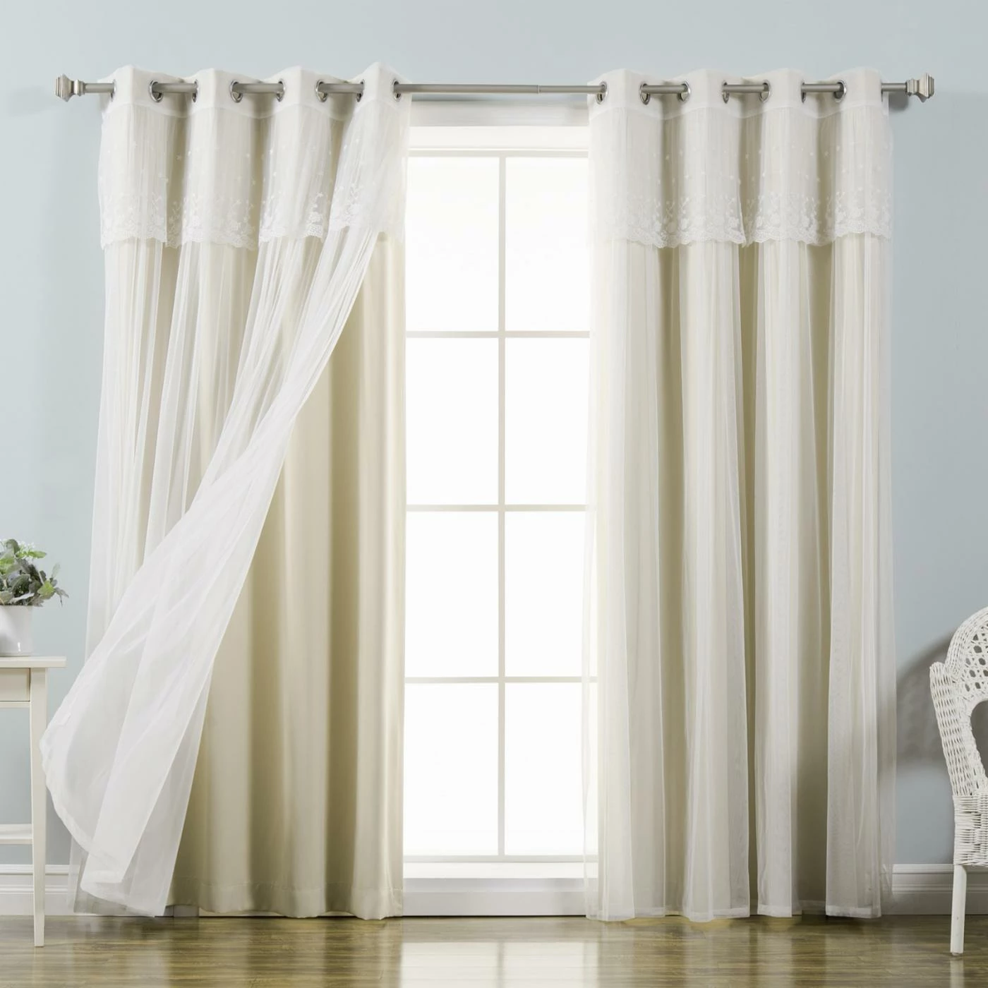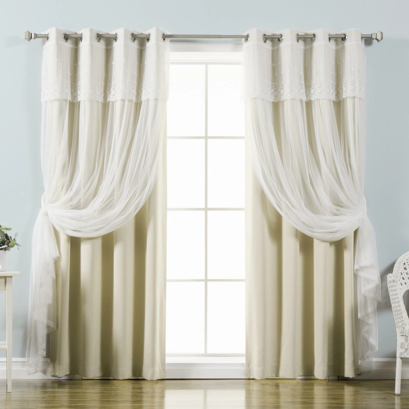 Add a hint of vintage romance to your room with the Best Home Fashion Mix & Match Tulle Blackout Curtain with Attached Valance – Set of 4. You’ll get four curtain panels with this set: two solid blackout panels and two sheer panels with an attached valance. The pleated tulle sheer panel is accented with floral embroidery on the valance, while the triple-weave blackout panels offer superior light control and insulation. All panels are made of 100 percent polyester, and the set is available in a choice of size and color.