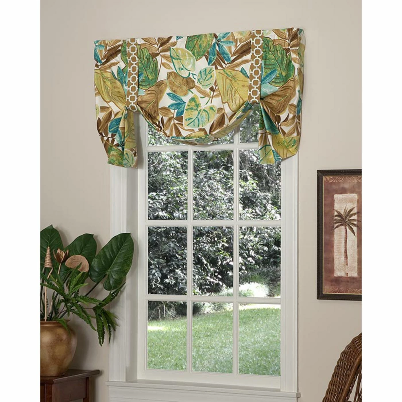 Add a botanical touch to your window with the Brunswick Tie Up Curtain by Thomasville at Home. Made in the U.S.A., this cotton tie-up curtain has a green, tan, and cream floral pattern. The 14-inch straps make it easy to tie the curtain up, creating a lovely swooping look. Rod pockets make installation easy. Pair this piece with other items from the Brunswick Collection on Hayneedle.com for a cohesive look.