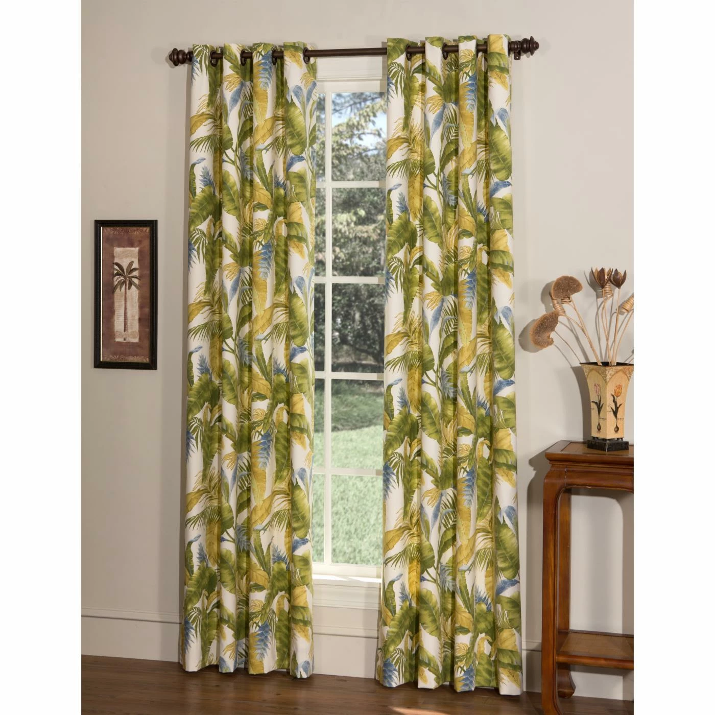 Frame any window with the Cayman II Rod Pocket Curtains by Thomasville at Home for a relaxed feel. These curtains are made of cotton duck with polyester-cotton lining. This set is decorated with green and gold palm leaves and blue tropical flowers. Each panel is equipped with metal grommets in a dark bronze finish. For best care, dry clean as needed.