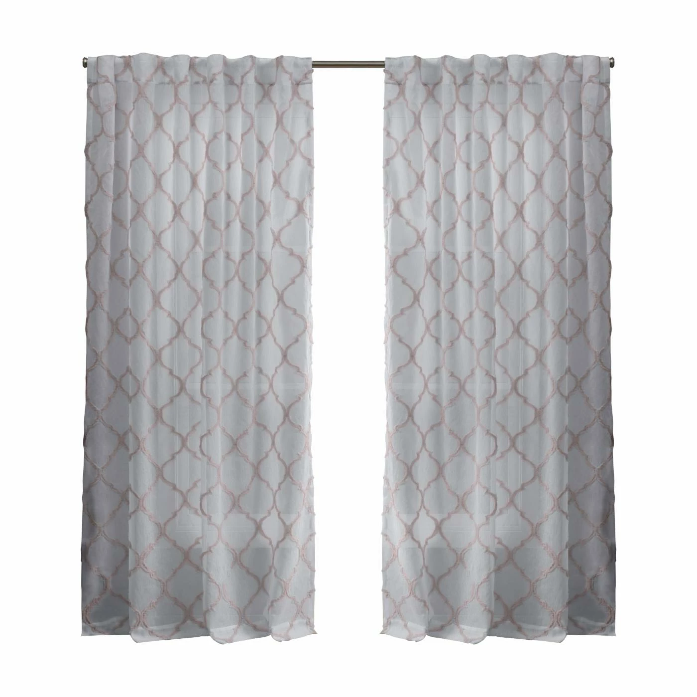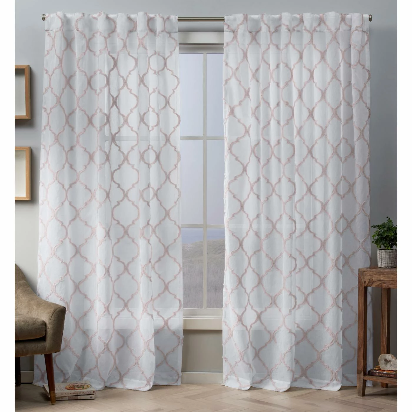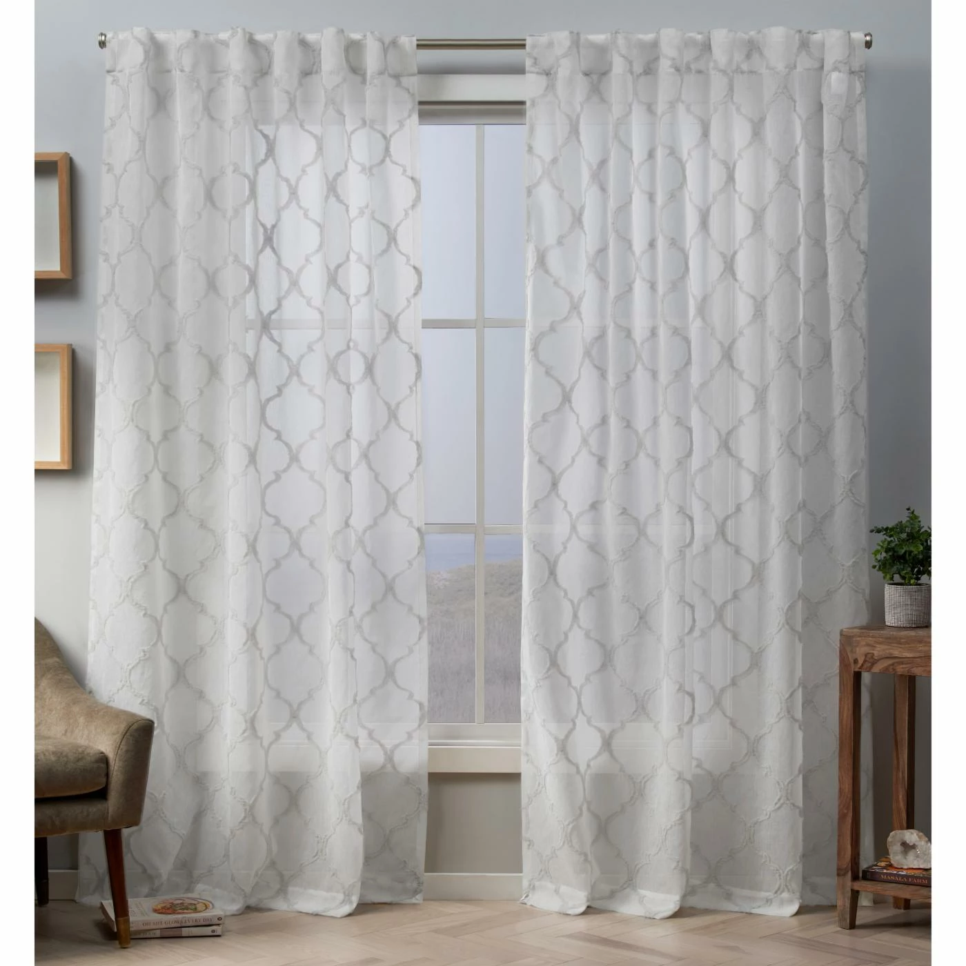 Add an elegant look to your bedroom or living room with the Exclusive Home Aberdeen Sheer Hidden Tab Top Curtain Panel Pair. The sheer linen-like fabric filters light for a soft glow in daytime. The trellis print comes in your choice of available colors. Hidden tabs make them easy to display on any size rod.