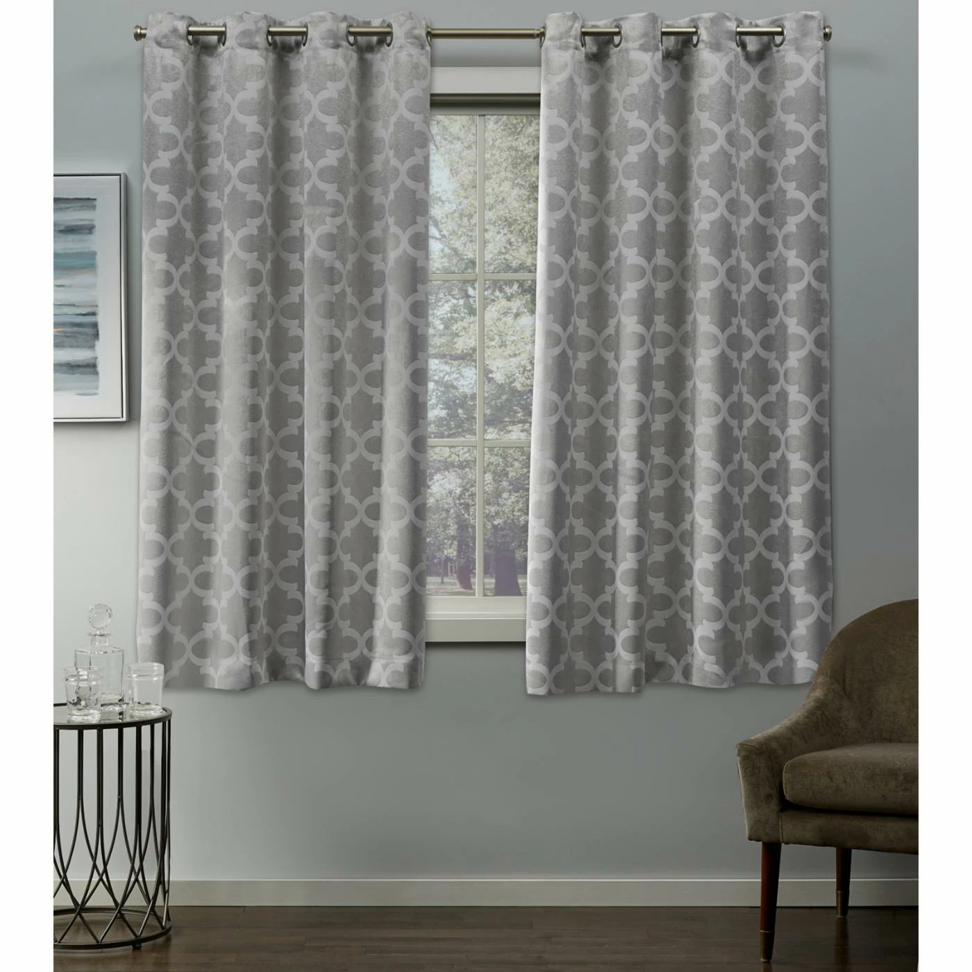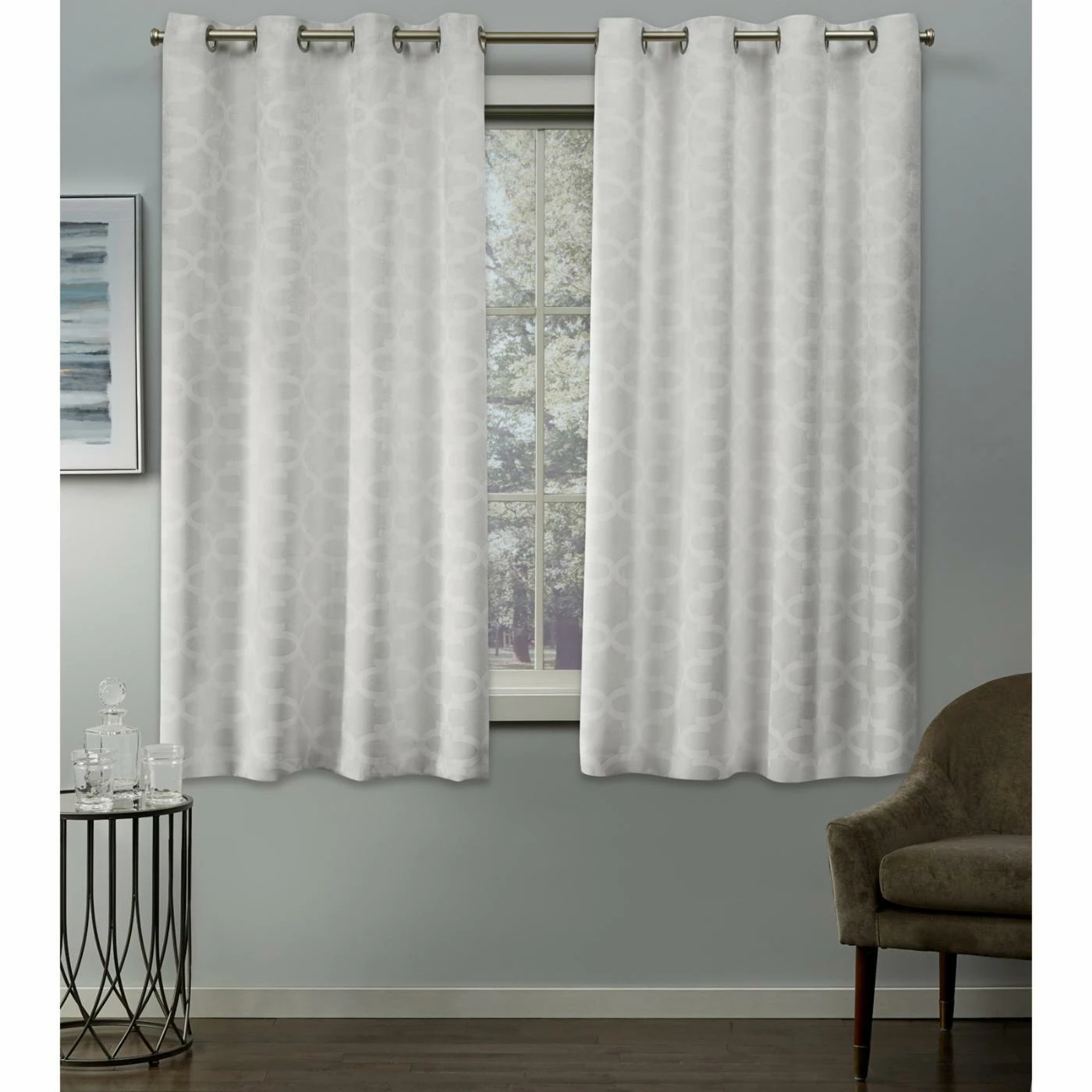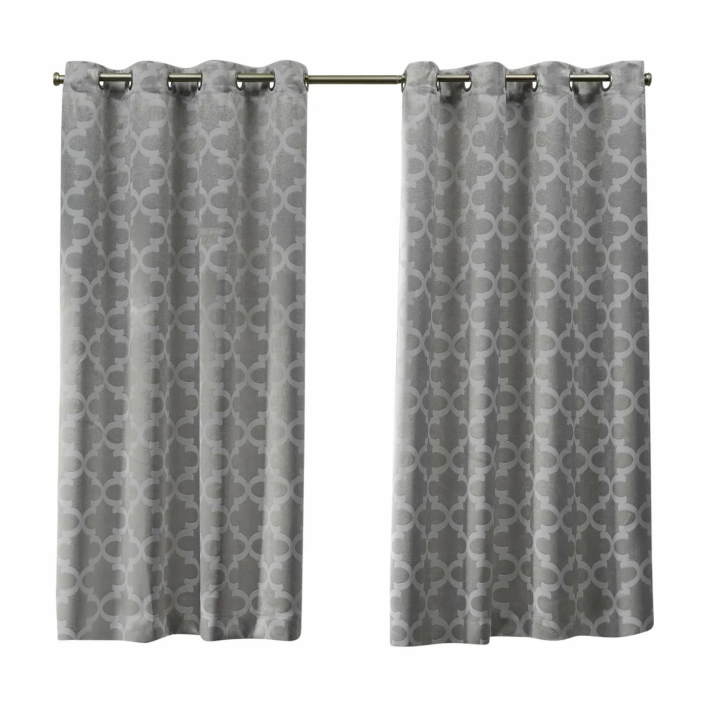 A quatrefoil trellis and contemporary grommet top make the Exclusive Home Cartago Blackout Grommet Curtain Panel Pair a quick way to revamp the look of any room. Light Block and Thermax technology mean these curtains block light, cold, and heat, too. Choose from the available color options for the ideal complement to your space.