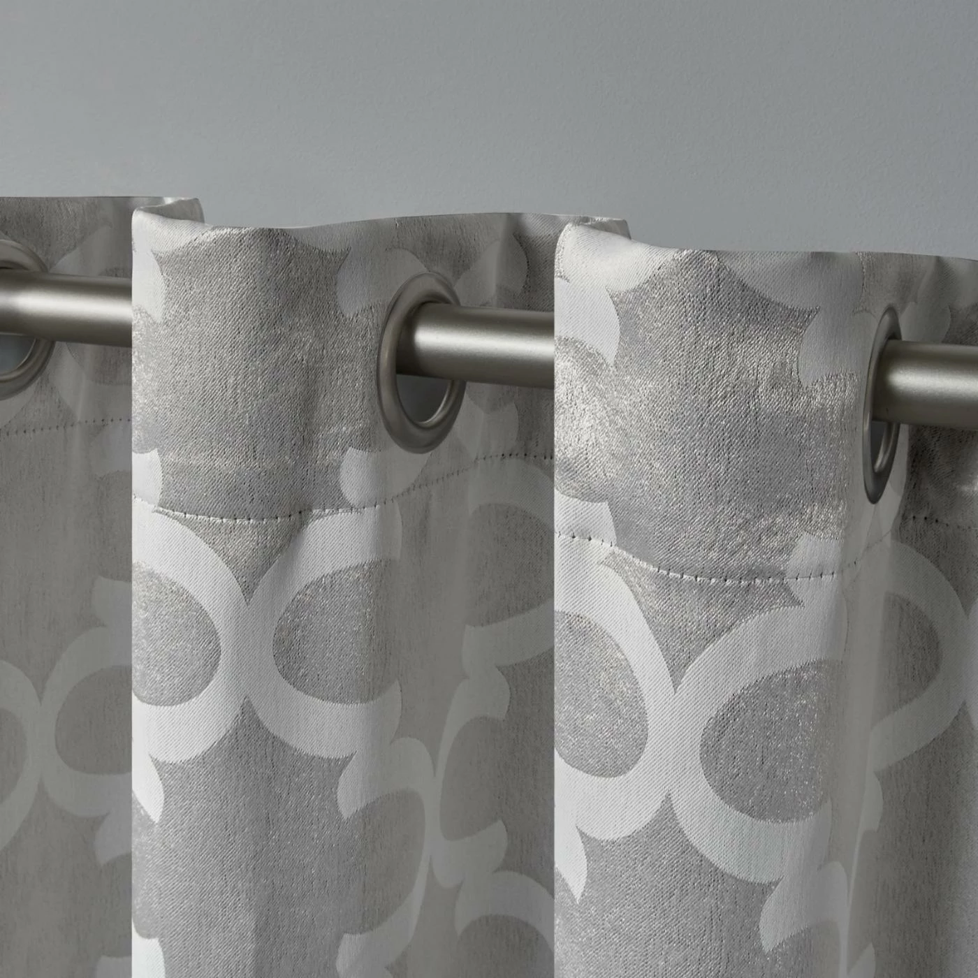 - Blackout curtains with 8 matte silver grommets per panel; fits 1.625-in. rod
