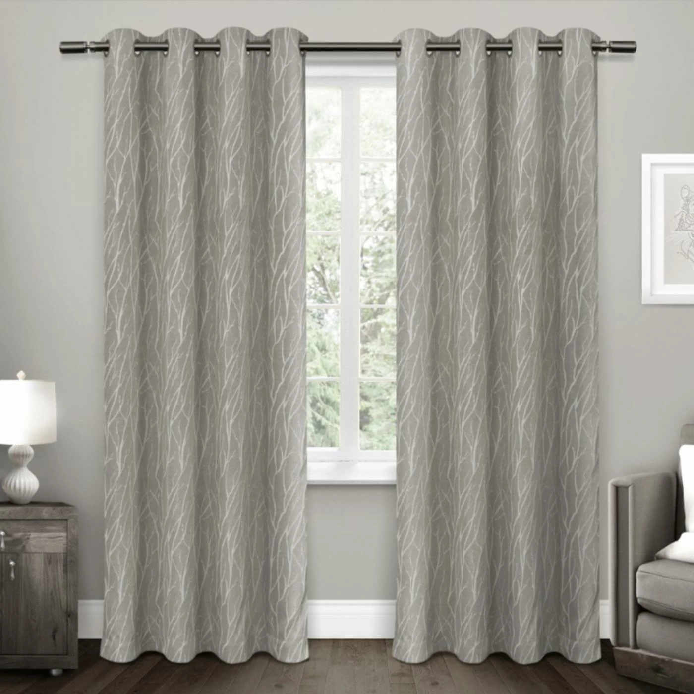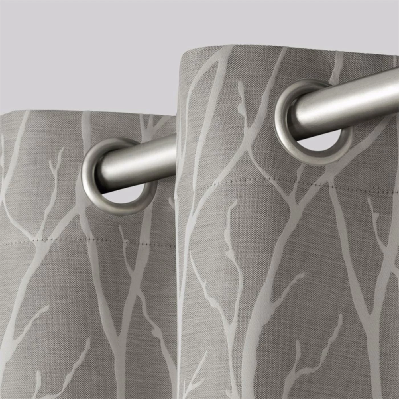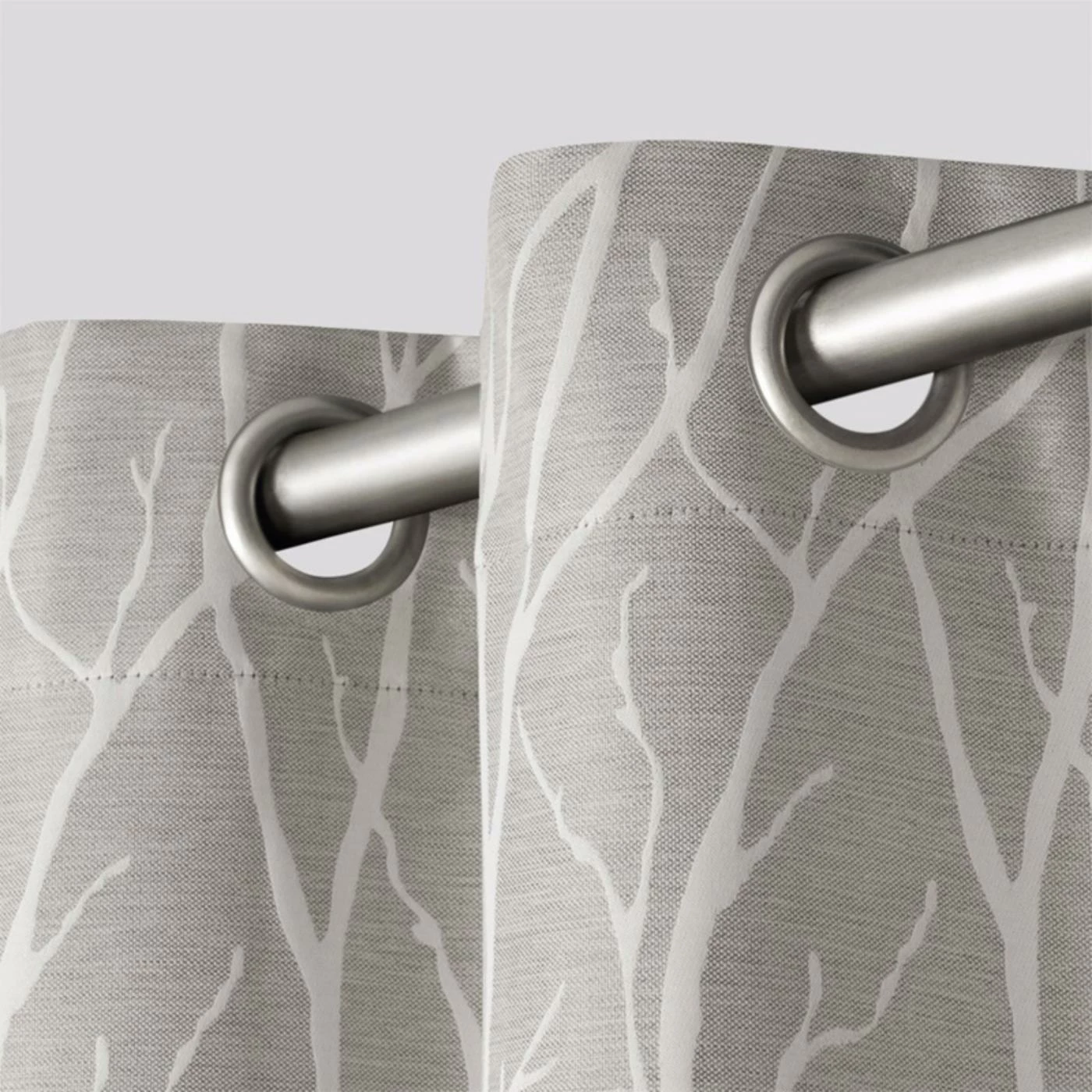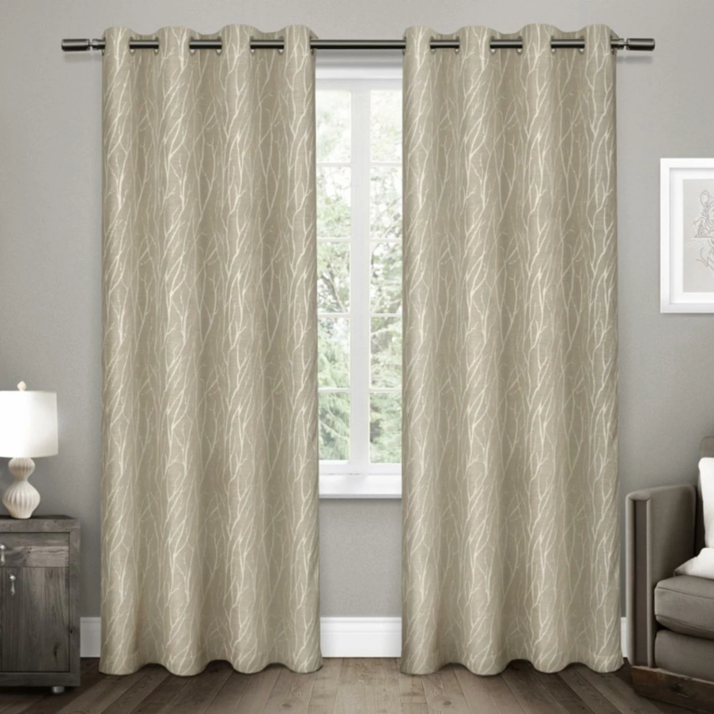 Exclusive Home Forest Hill Woven Room Darkening Grommet Curtain Panel Pair will go to work while looking great in your home. The Forest Hill design offers a stylish linen look and natural branch finish complete with matte silver grommets. The Lightblock and Thermax technology is woven throughout the panels and effectively blocks light and UV rays from entering your home or office. These panels prevent cold and heat from entering your home, increasing your energy efficiency and decreasing your energy bills. Panels are 54 inches wide and offered in your choice of two lengths: 84 or 96 inches.
