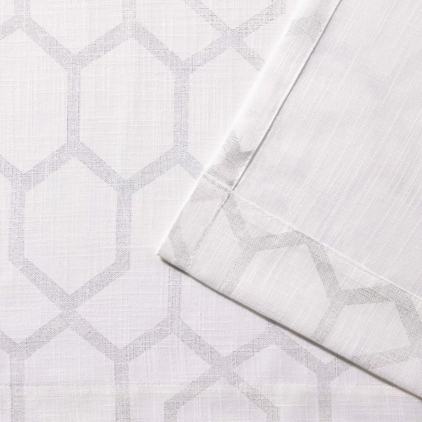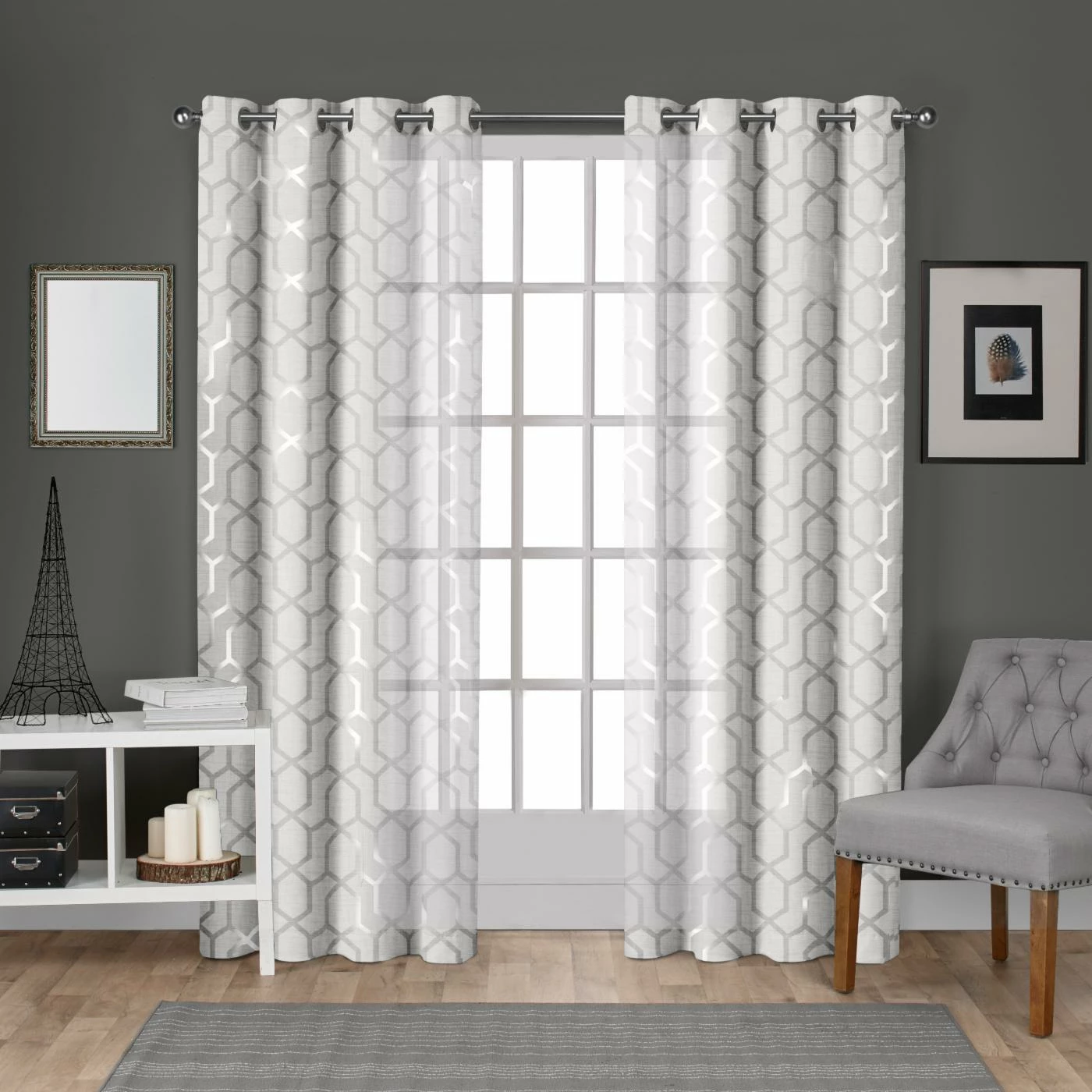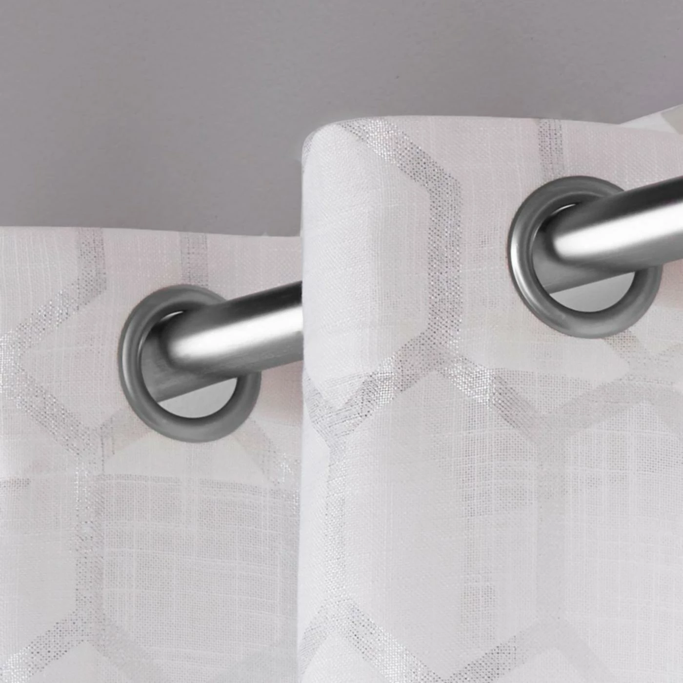 The Exclusive Home Panza Printed Metallic Geometric Grommet Top Curtain Panel Pair provides your bedroom or living room with a little privacy and a lot of elegance. Two white, polyester panels are included in this set, and they are printed with a metallic silver trellis pattern. At the top of each panel, eight matte silver grommets slide over your existing curtain rods, up to 1.625 diameter. Choose from the available panel size options. Spot clean or hand wash the panels to keep them pristine, and press with a low-heat iron. The rod and hanging hardware are not included.