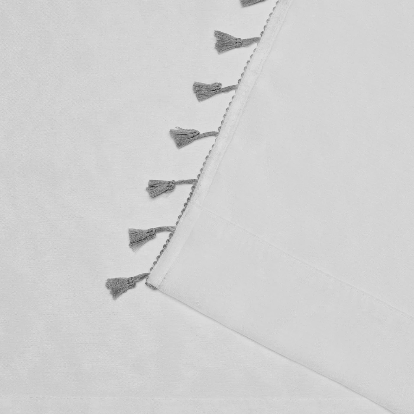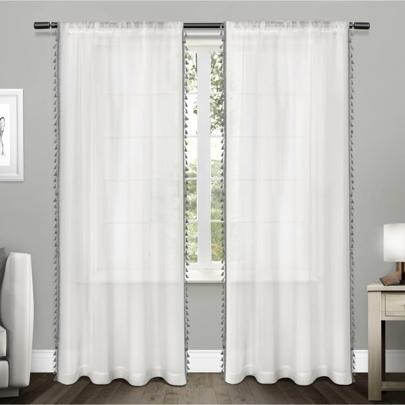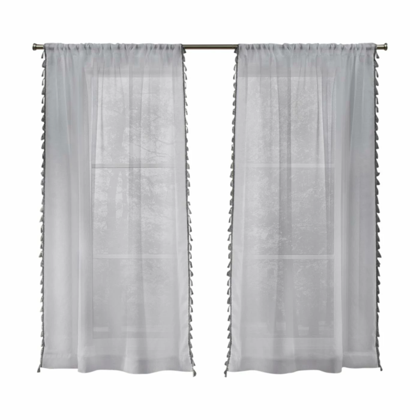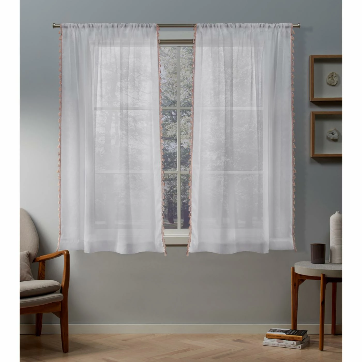 For a boho chic touch, the sheer white Exclusive Home Tassels Rod Pocket Curtain Panel Pair is embellished with applique tassel borders in your choice of available color. You’ll love the personality and pop of color these sheer curtains bring your room. Choose from the available tassel color and size options.