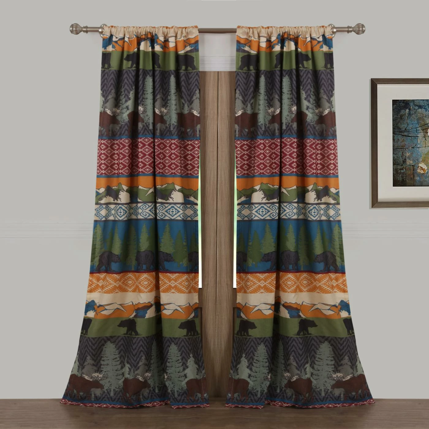 The Greenland Home Fashions Black Bear Lodge Panel Pair makes your favorite room feel even cozier with almost no effort. Two matching curtain panels are included in this set, each featuring tie-backs, a deep rod-pocket, and a sun-shading panel. 100% polyester microfiber is used to craft the piece, making them easily machine-washable. A lodge-style patchwork bear-and-tree design adorns the set, featuring a rich, earthy color scheme.