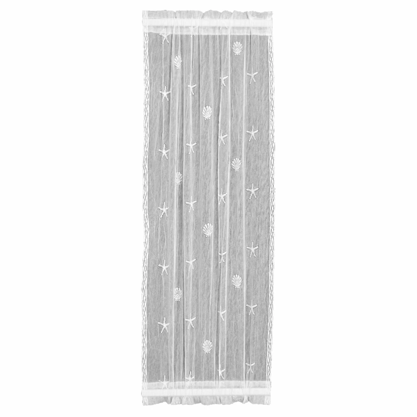 The Heritage Lace Sand Shell Sidelight Curtain Panel brings a breezy beach feel to your home. The polyester lace work features a delicate pattern of seashells and starfish. This curtain panel is equipped with a 1.5-inch rod pocket and is machine washable for easy cleaning. It’s offered in your choice of available size and color.