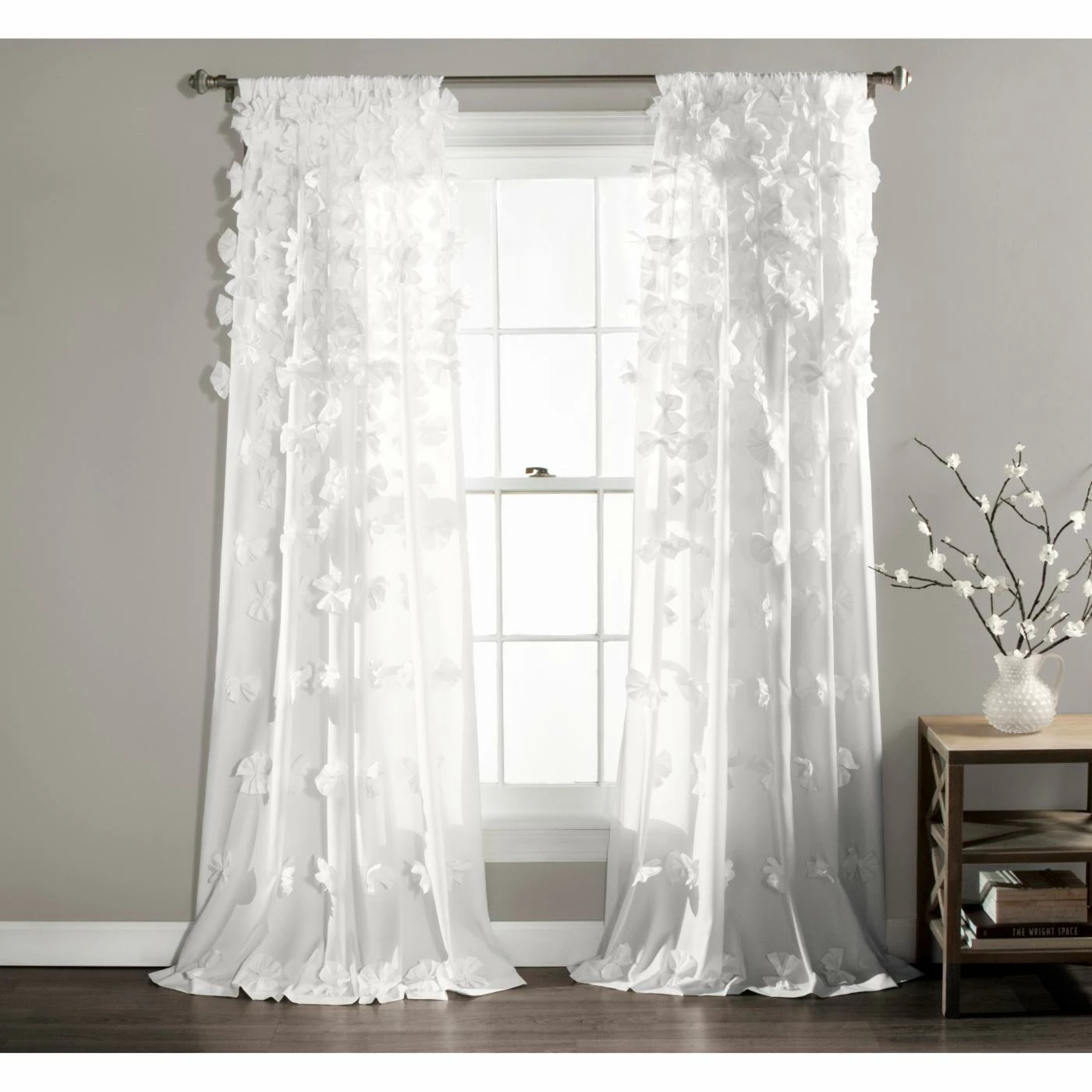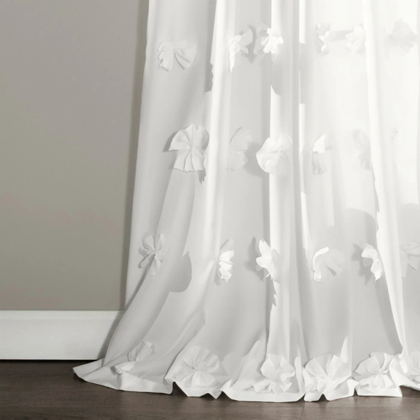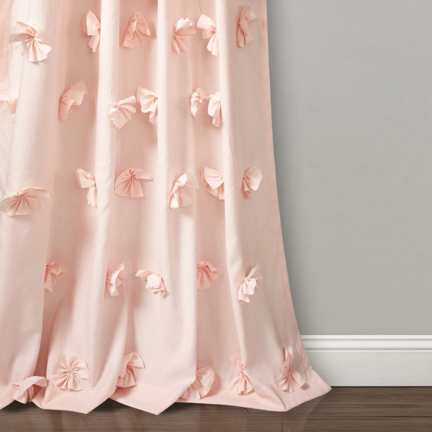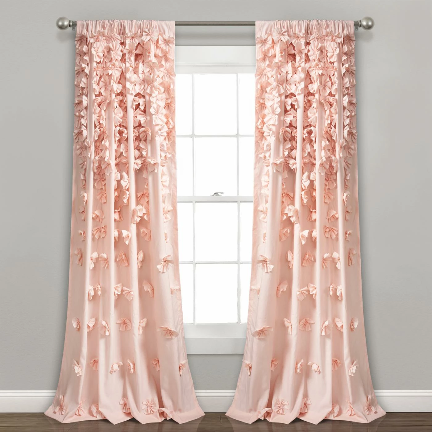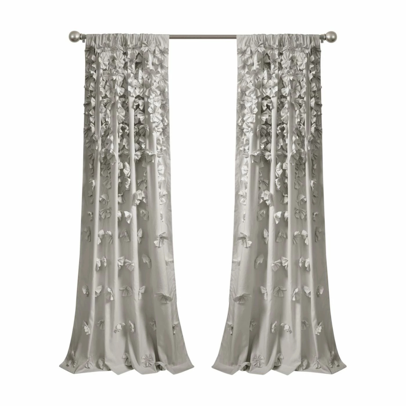 The Lush Decor Riley Rod Pocket Curtain Panel just might be the wow factor your living room, bedroom, or dining room needs. Cascades of bold, beautiful handmade bows flow from top to bottom down the 100% soft-brushed, unlined polyester. The design is available in your choice of available color, and a three-inch rod pocket makes installation easy. Dry clean only. Sold as a single panel.