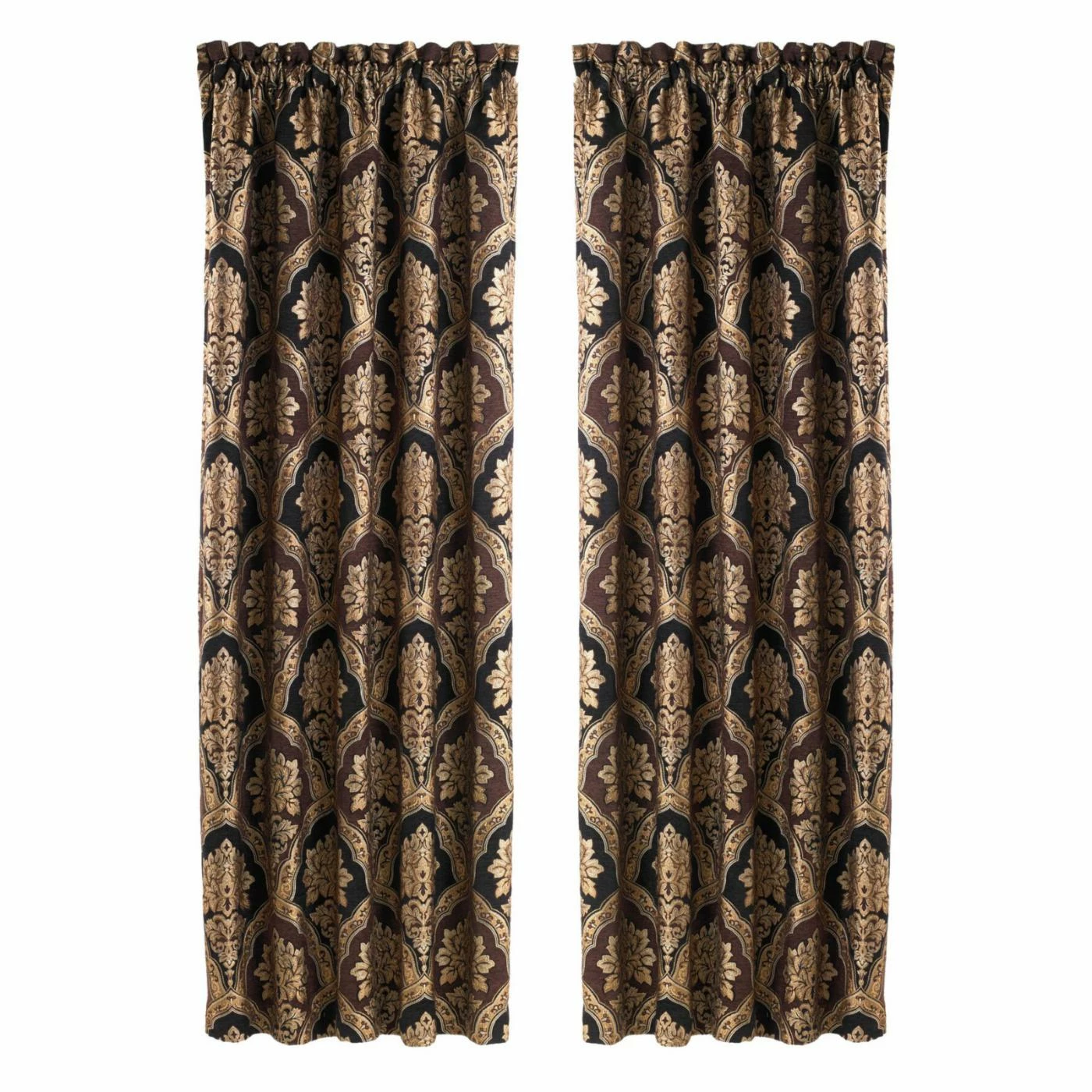 Bring double-duty beauty to your living room or bedroom with the Reilly Woven Chenille Damask Room Darkening Panel Pair by Five Queens Court. These woven chenille panels feature a graceful damask pattern in rich gold, black, and brown and serve as an upscale accent for your space. On the reverse side, these energy-efficient panels are lined to help darken a room and to keep your home comfortable. You can use the coordinating tiebacks if you opt for an airier look. For luxurious, layered style, pair these panels with the Reilly Ascot Valance (sold separately).