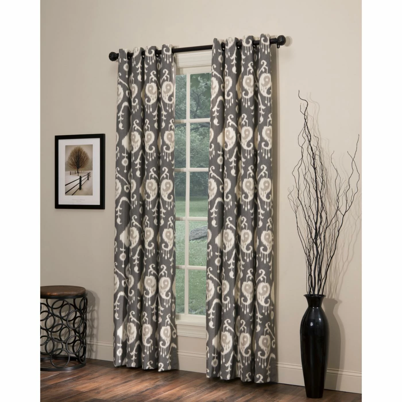 Enjoy a modern ikat pattern in your home by hanging the Salazar Grommet Curtains by Thomasville at Home. Its gray and cream color palette are easy to coordinate with your existing bedroom or living room dΓ©cor. Metal grommets slide over your curtain rod for simple installation.
