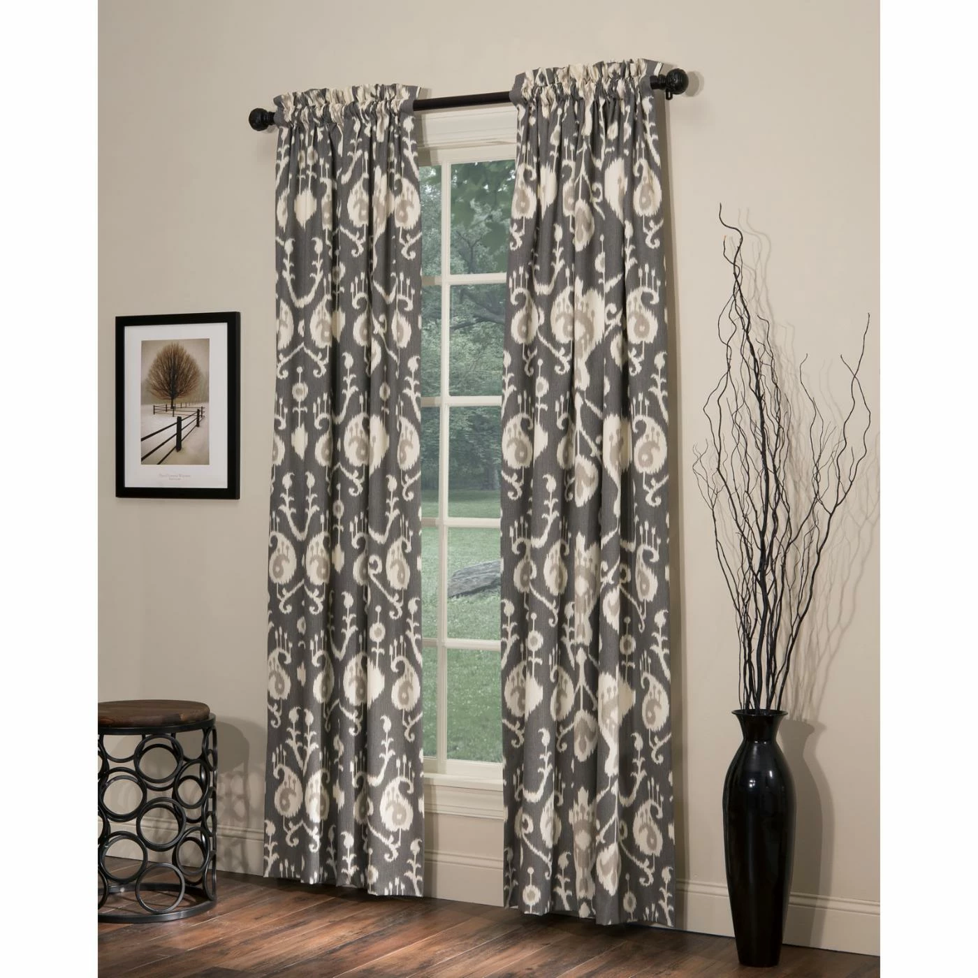 Enjoy a modern ikat pattern in your living room or bedroom by hanging the Salazar Rod Pocket Curtains by Thomasville at Home. Its gray and cream color palette are easy to coordinate with your existing home dΓ©cor. Fully-lined pockets slide over your curtain rod for simple installation.
