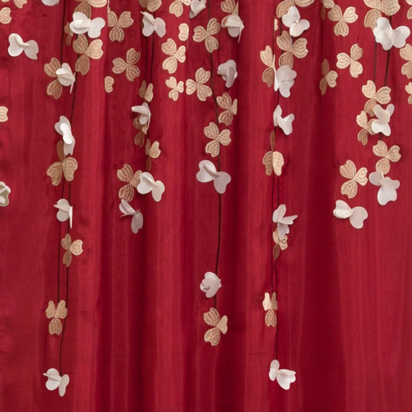 The Triangle Home Fashions Flower Drops Window Curtain Set comes complete to do your windows up right. This fine set of curtains and a valance is made completely from polyester and comes in your choice of rich colors. It’s accented with beautiful flowers and butterflies fluttering off the fabric, and is dry clean only.