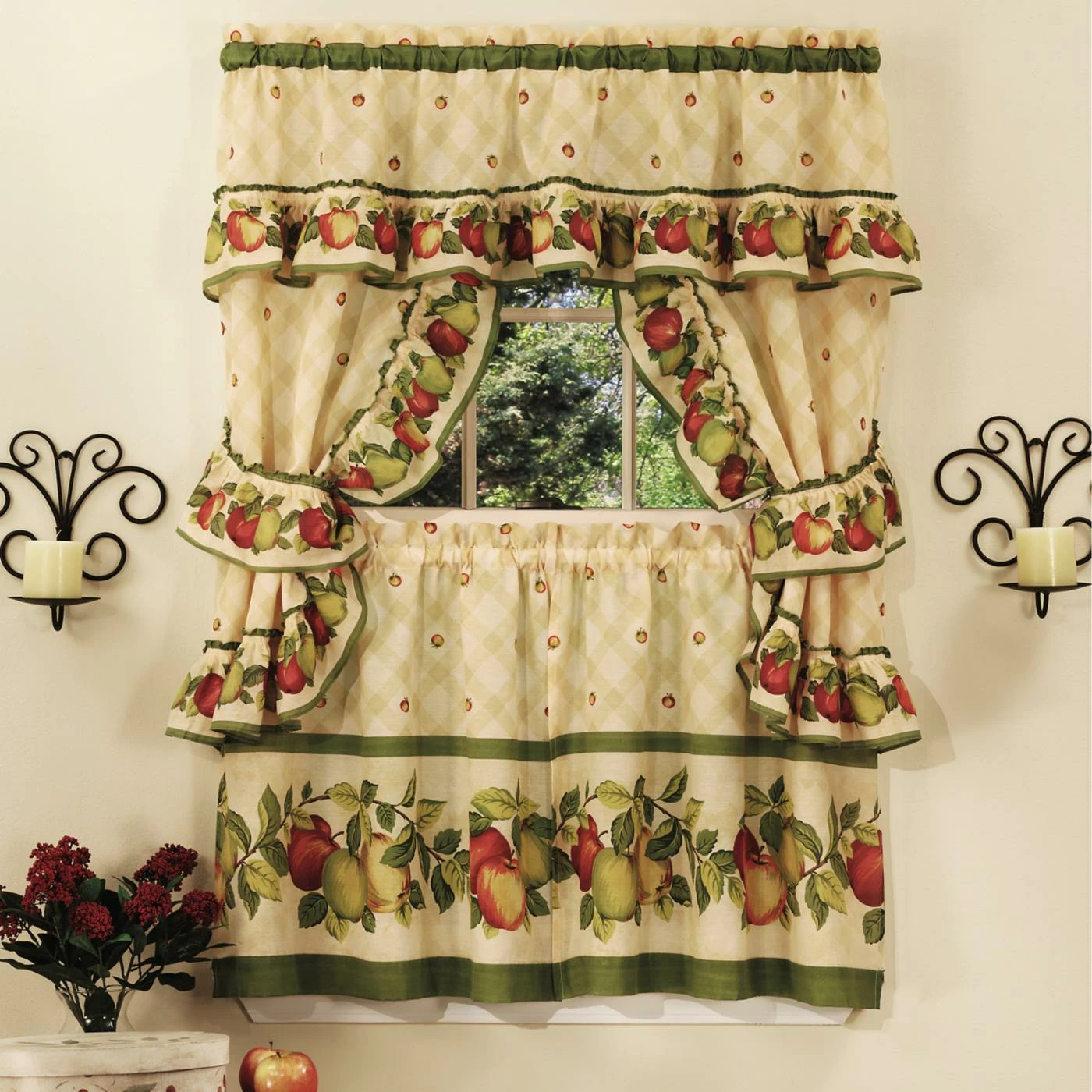 The traditionally designed Achim Apple Orchard Cottage Curtain Set makes for an adorable window arrangement. This ruffled collection of polyester curtains comes in a light beige color with rich green borders and a detailed print of red, green, and golden delicious apples.