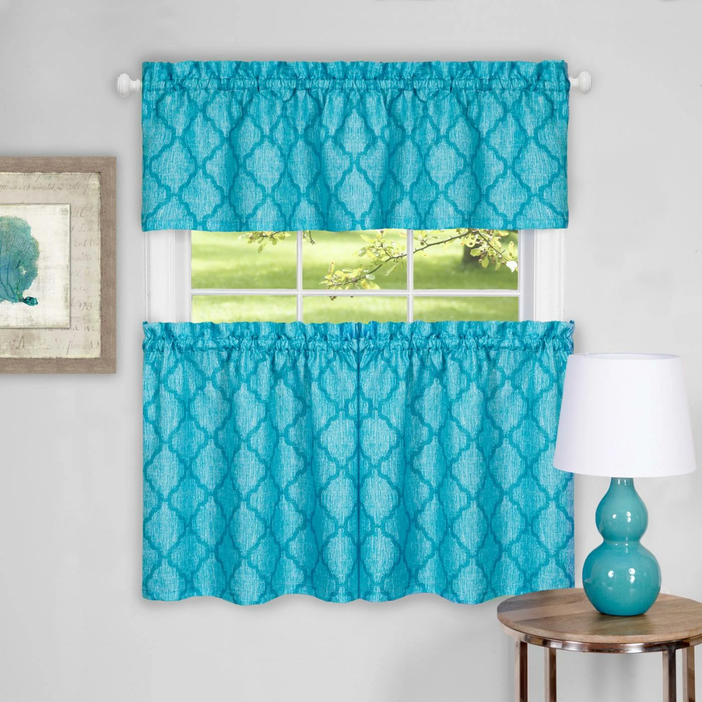 A tonal ogee trellis in your choice of available color story makes the Achim Colby Window Curtain Tier Pair and Valance Set a contemporary way to dress your window. This set includes a rod pocket valance and two matching curtain tiers that are perfect for your kitchen or any casual setting. Choose from the available size options.