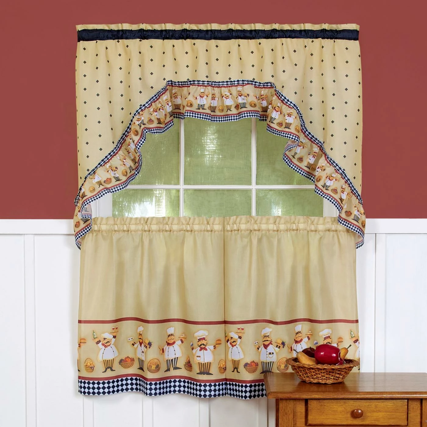 The playfully designed Achim Cucina Printed Tier Curtain and Swag Set features cartoon chefs, baskets of fruit and bread, and a decorative black and white diamond border accompanied with a solid stripe band. Both the swag and tier curtain are made from bright polyester fabric with an allover pattern, and the swag also boasts a solid black rod pocket.