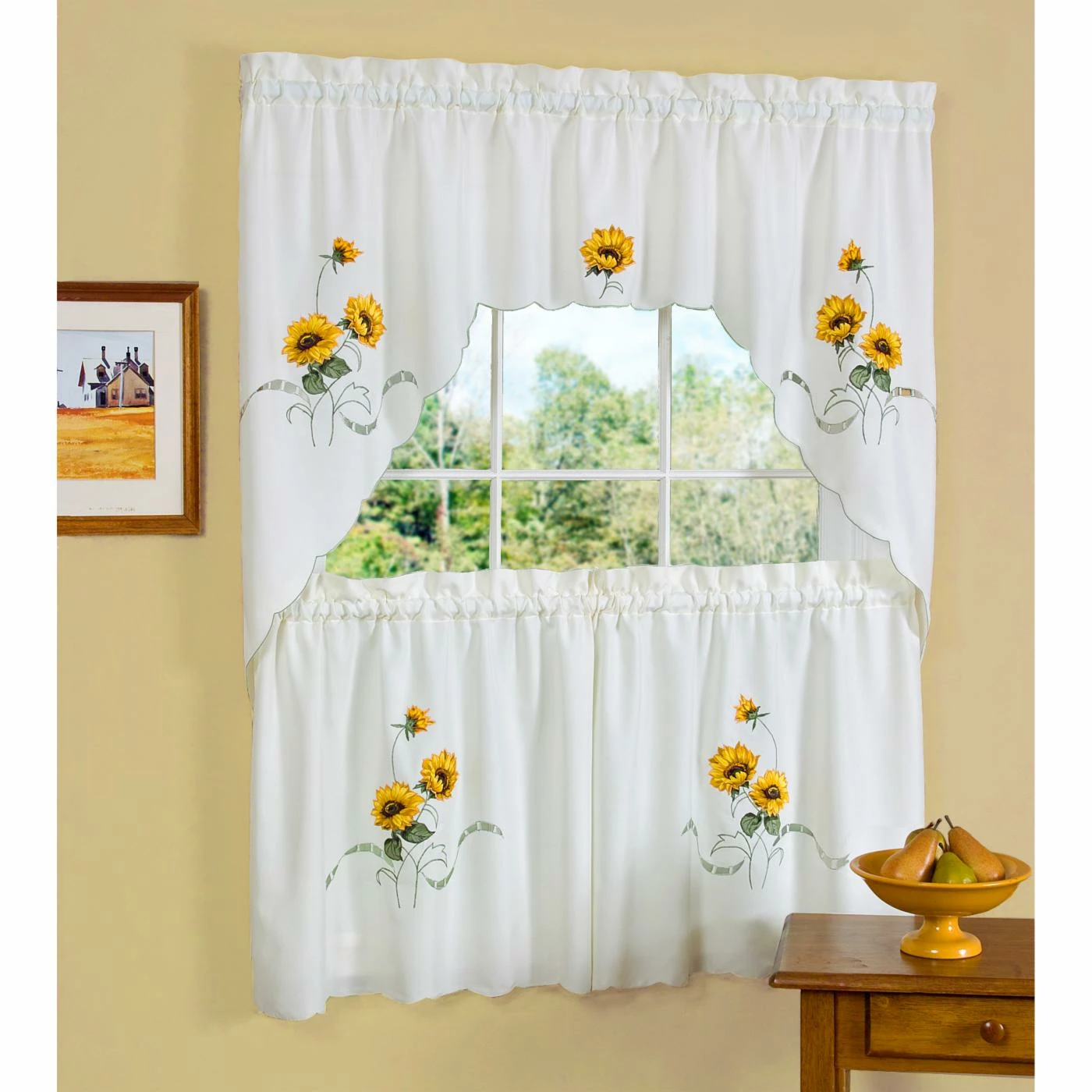 The Achim Sunshine Embellished Tier Curtain and Swag Set features embroidered and appliquΓ© flowers that brighten any dΓ©cor. The Rudbeckla hirta or Black-eyed Susan is a charming spring flower whose yellow petals look gorgeous against the pure white drapery of this two-piece set with eyelet and scalloped edges and green merrow stitching.