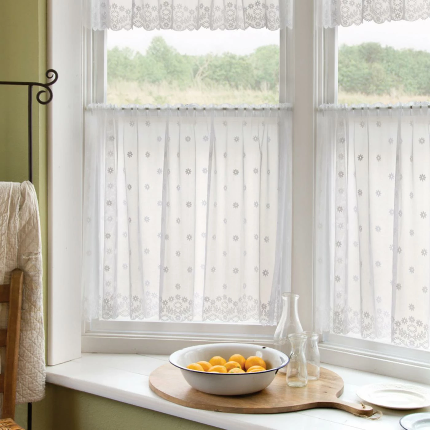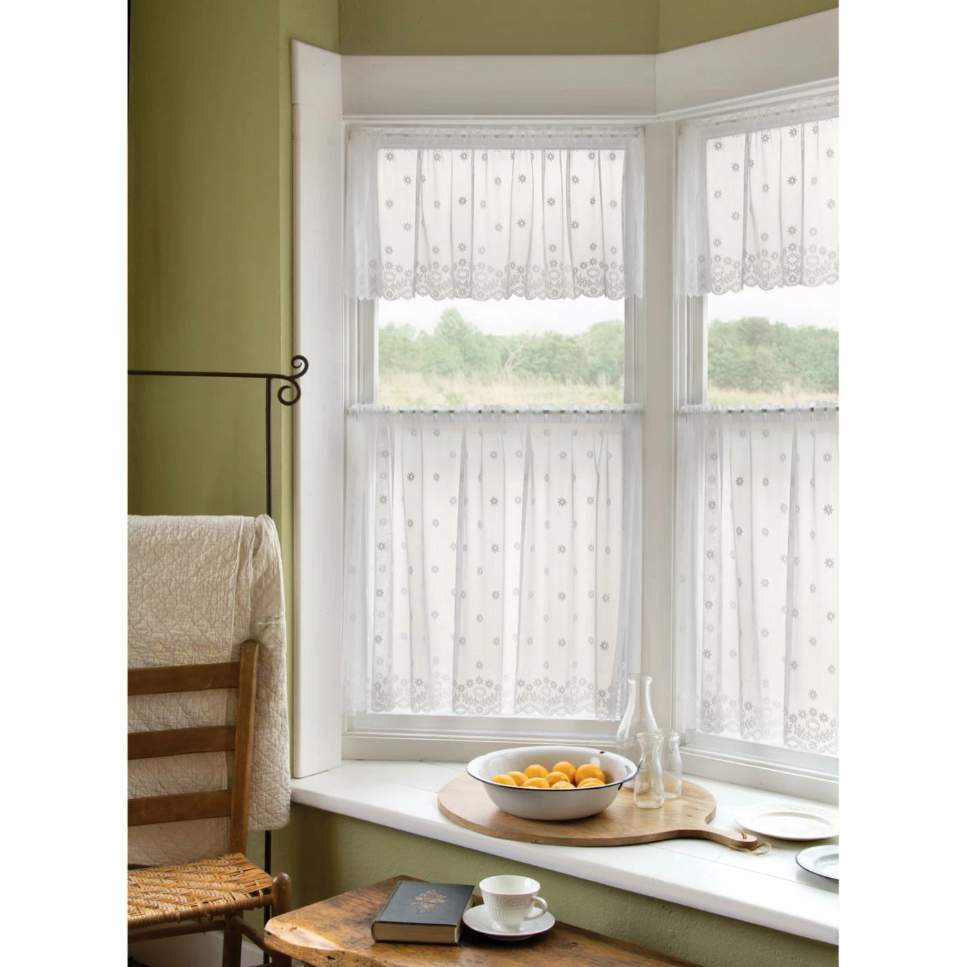 Set a delicate, ethereal tone in any room with the Heritage Lace Daisy Curtain Tier. This polyester lace curtain tier showcases a dainty daisy print. It’s offered in the available size and color options. The sheer netting background of this curtain tier softly filters sunlight for gentle illumination.