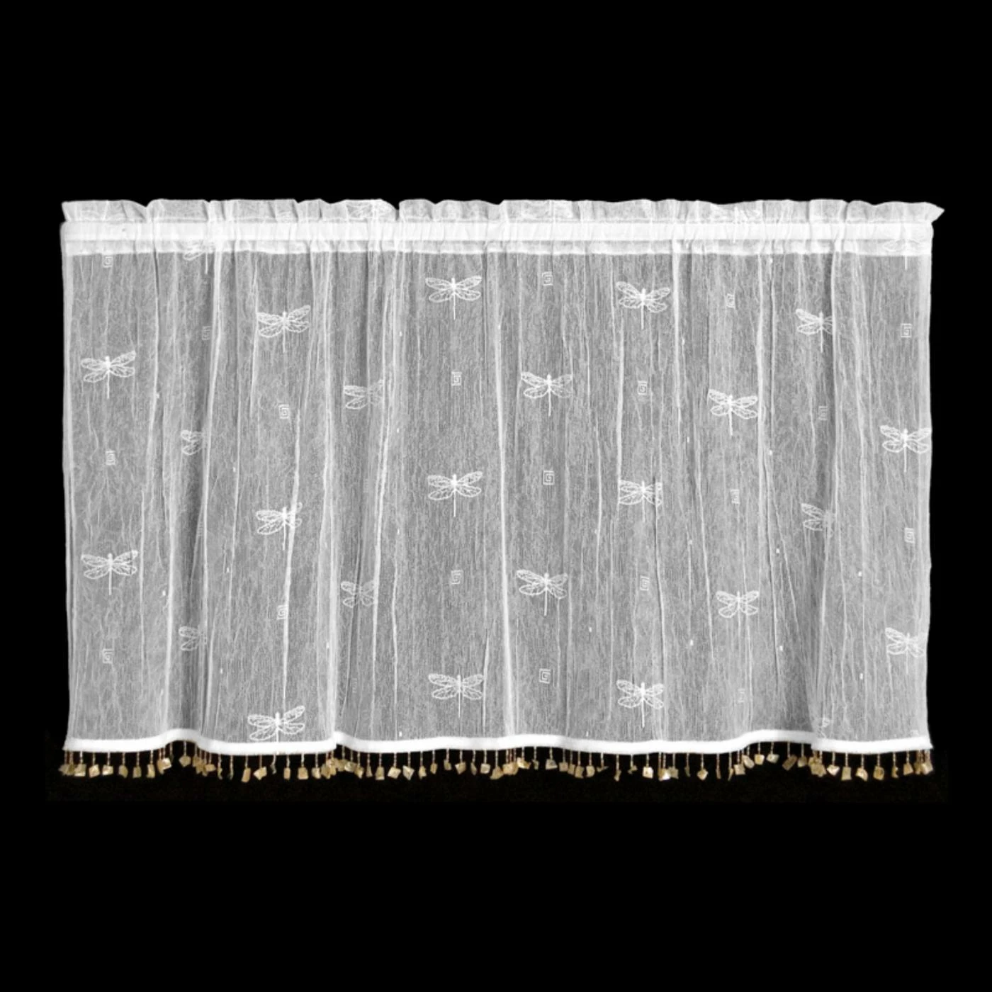 Embellish your window with the enchanting style of the Heritage Lace Dragonfly Tier with Trim. This lace tier is sprinkled with delicate dragonflies and edged with a tussled trim. It’s durably crafted from machine-washable polyester and installs easily using a classic rod pocket top design.