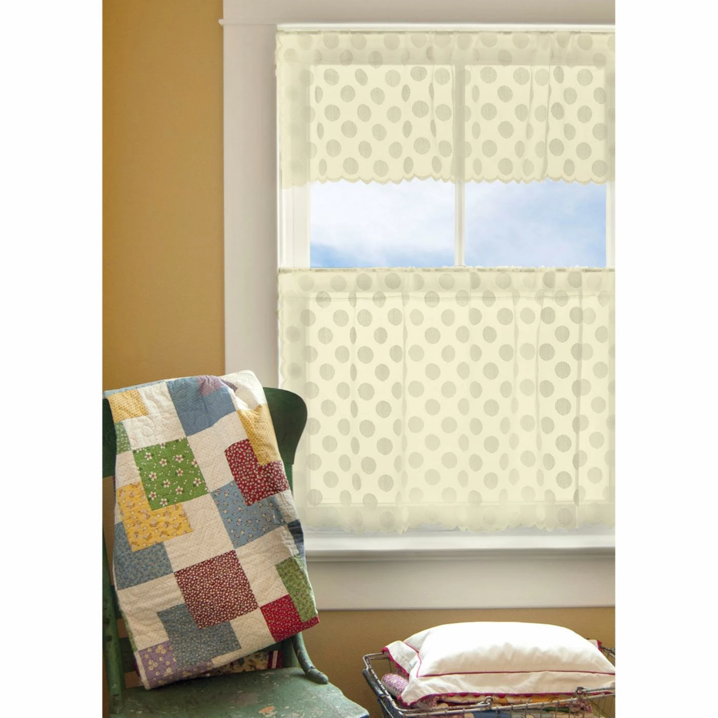 The Heritage Lace Polka Dot II Curtain Tier softly filters sunlight through its delicate polyester construction. This curtain tier showcases a cheery polka dot print and is equipped with a 1.5-inch rod pocket. It’s offered in the available size and color options.