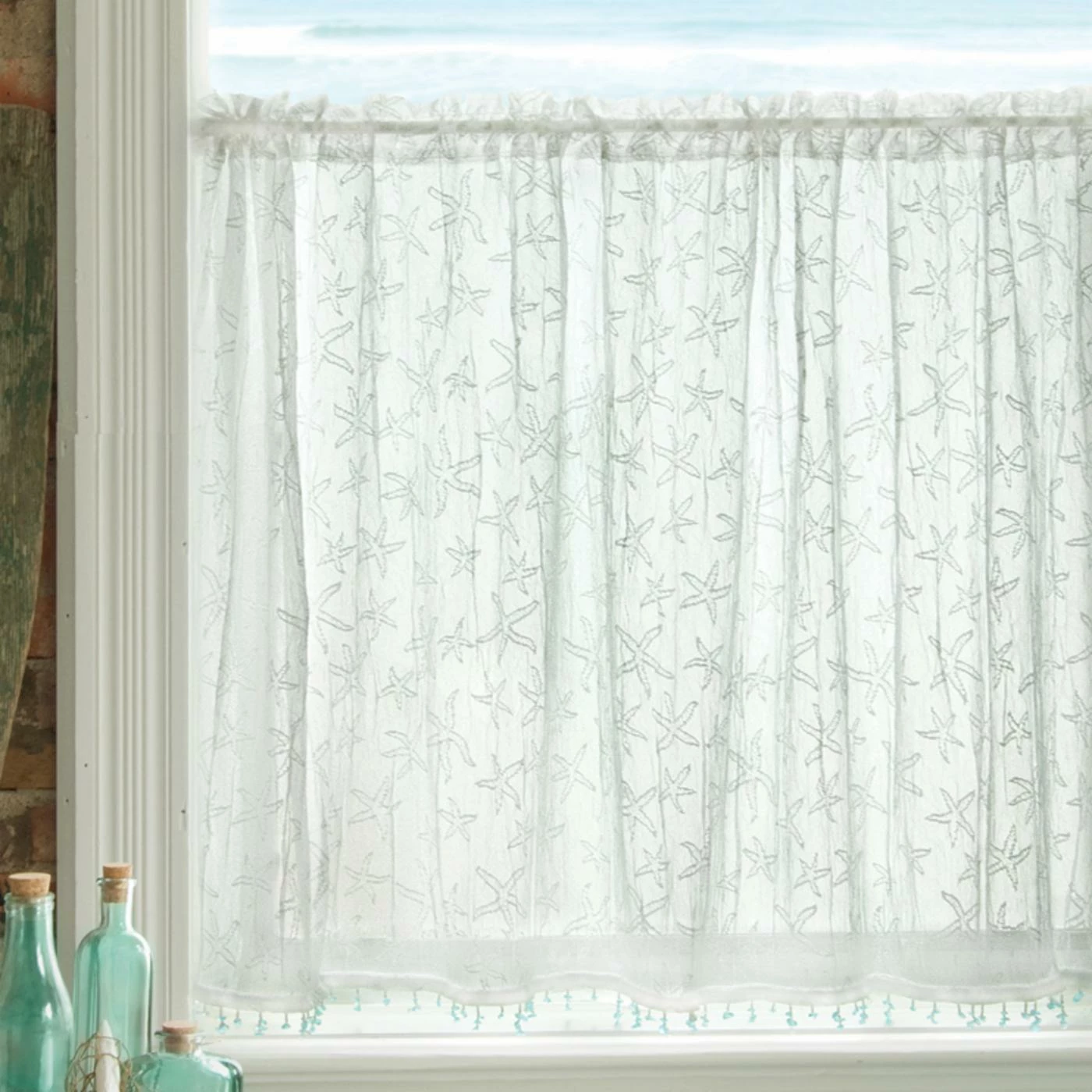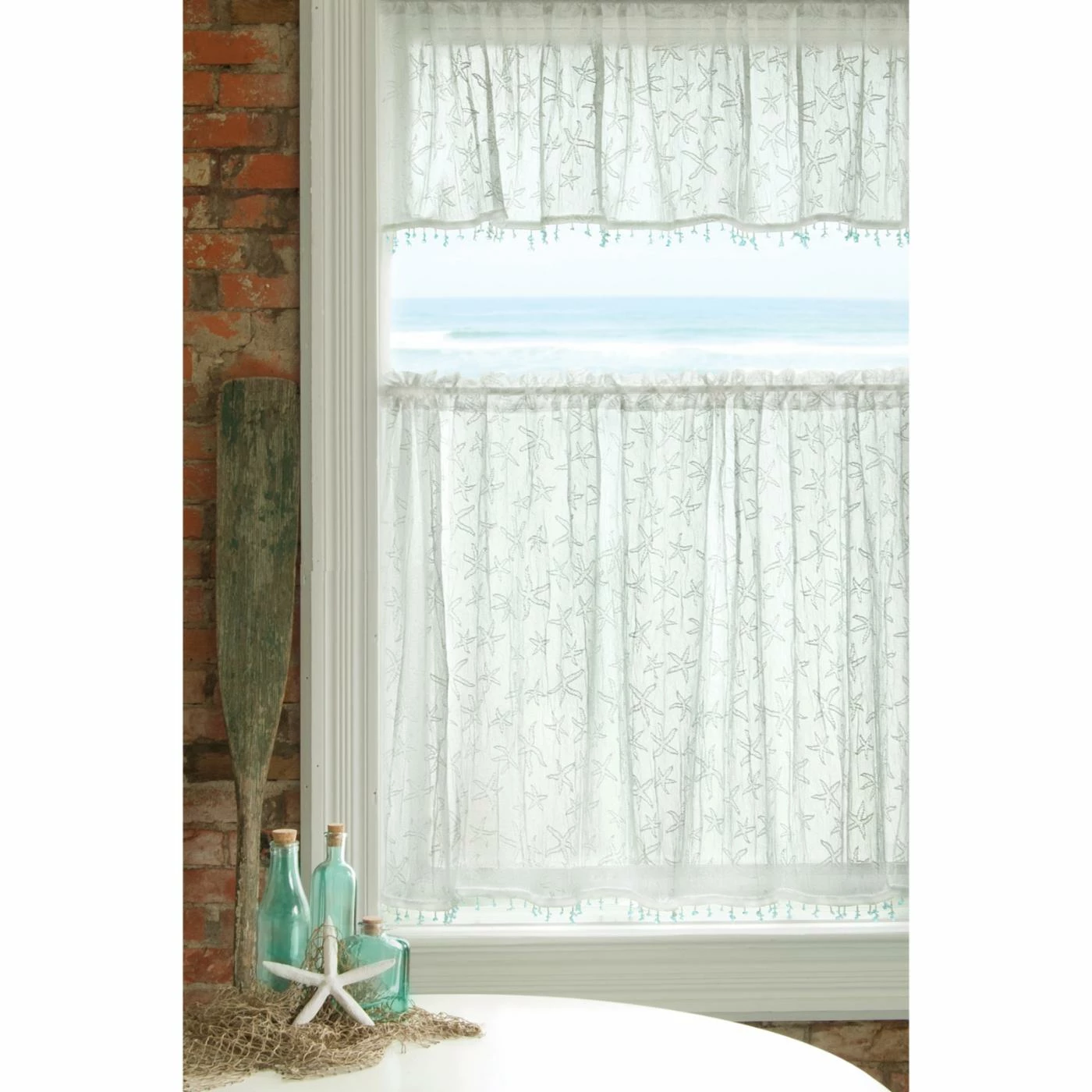 The Heritage Lace Starfish Curtain Tier wows with its delicate polyester work and endless starfish pattern. Delicate sea glass trim completes the beachy vibe of this curtain tier. It’s offered in multiple size options.